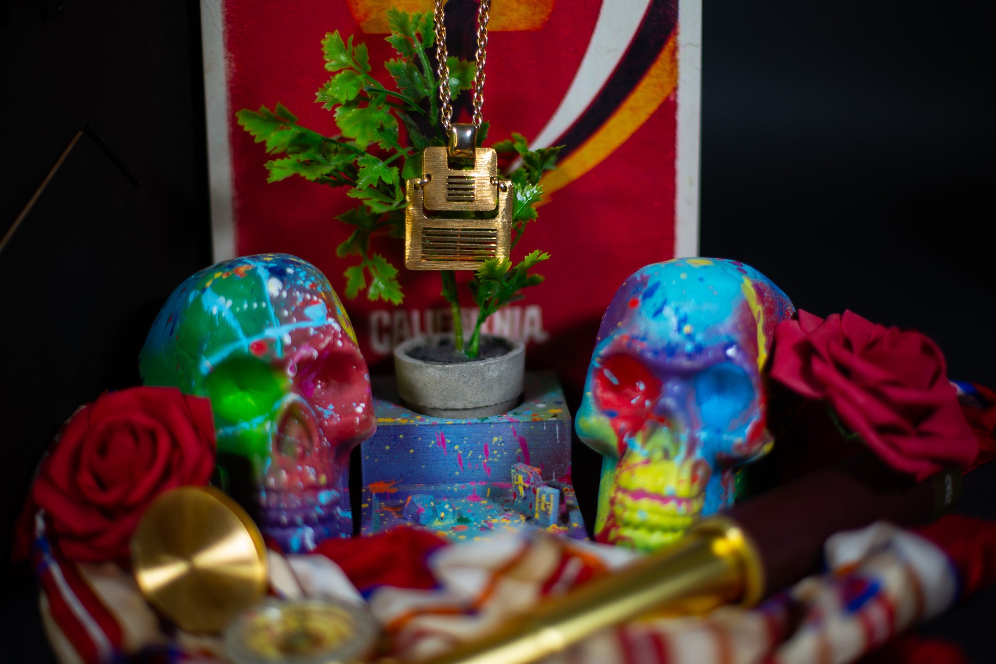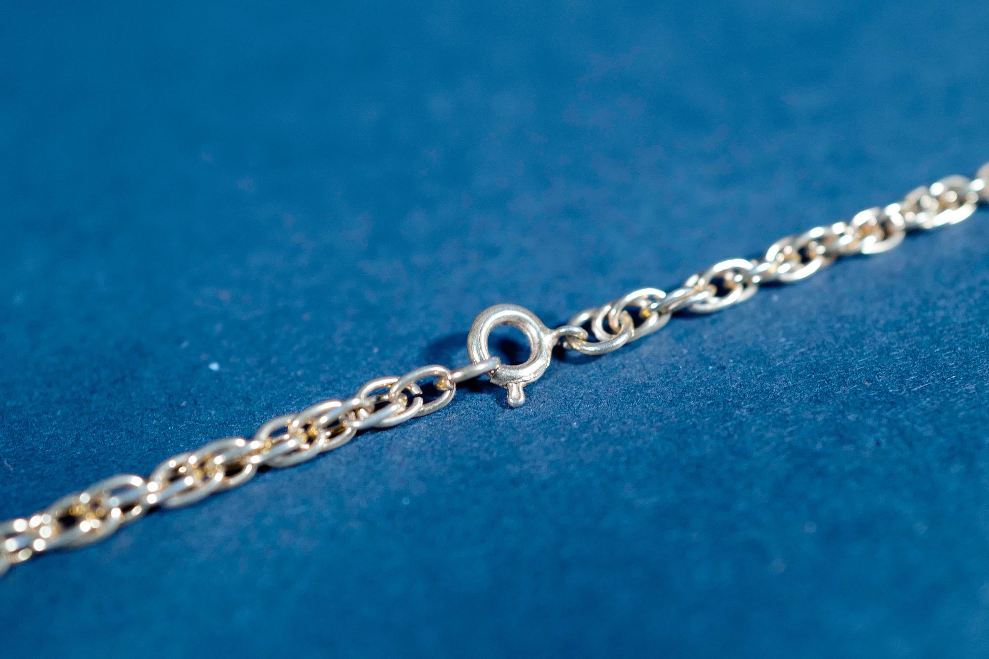 This is a vintage necklace with a geometric pendant reminiscent of plate armor. Good condition.