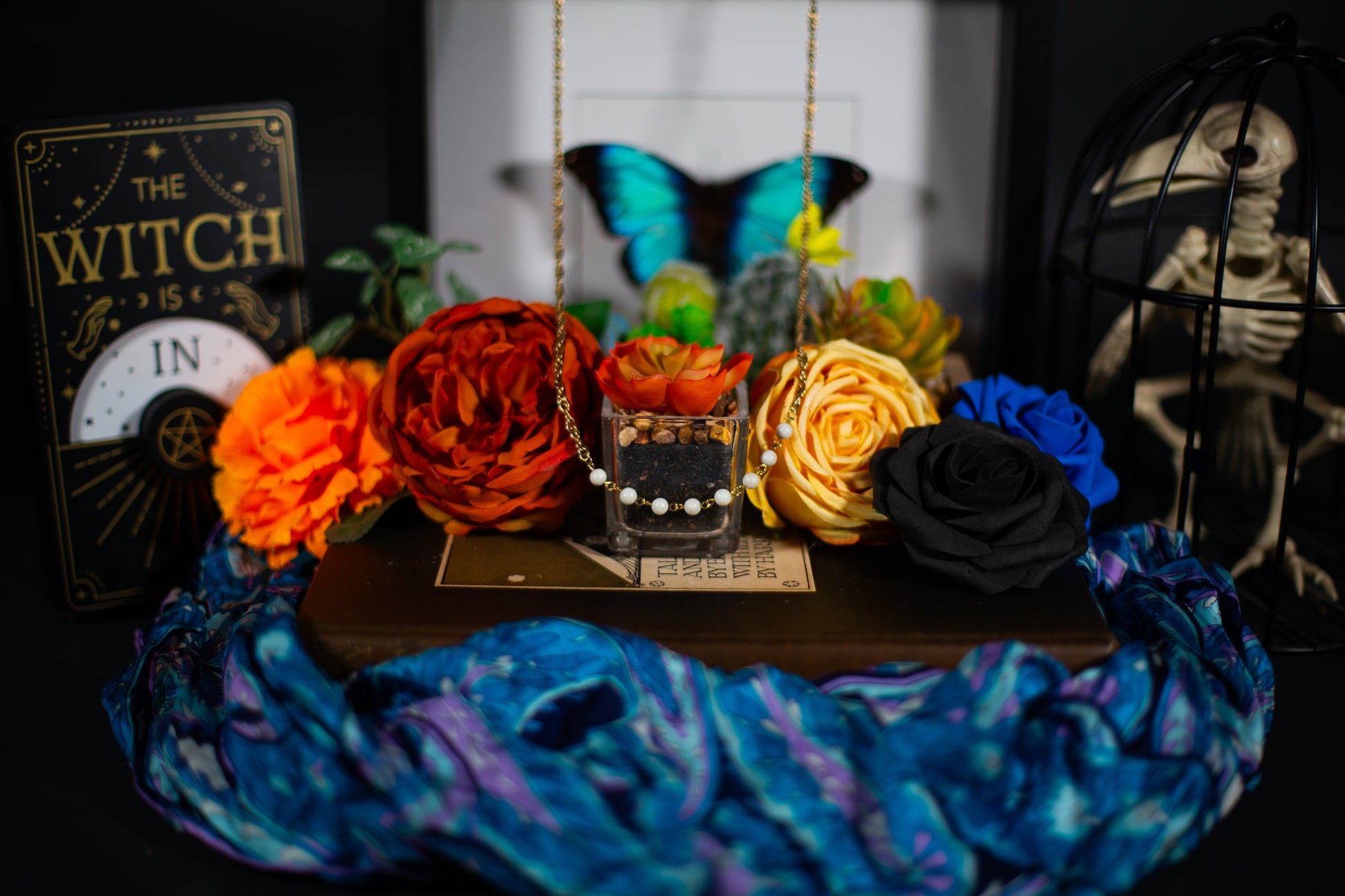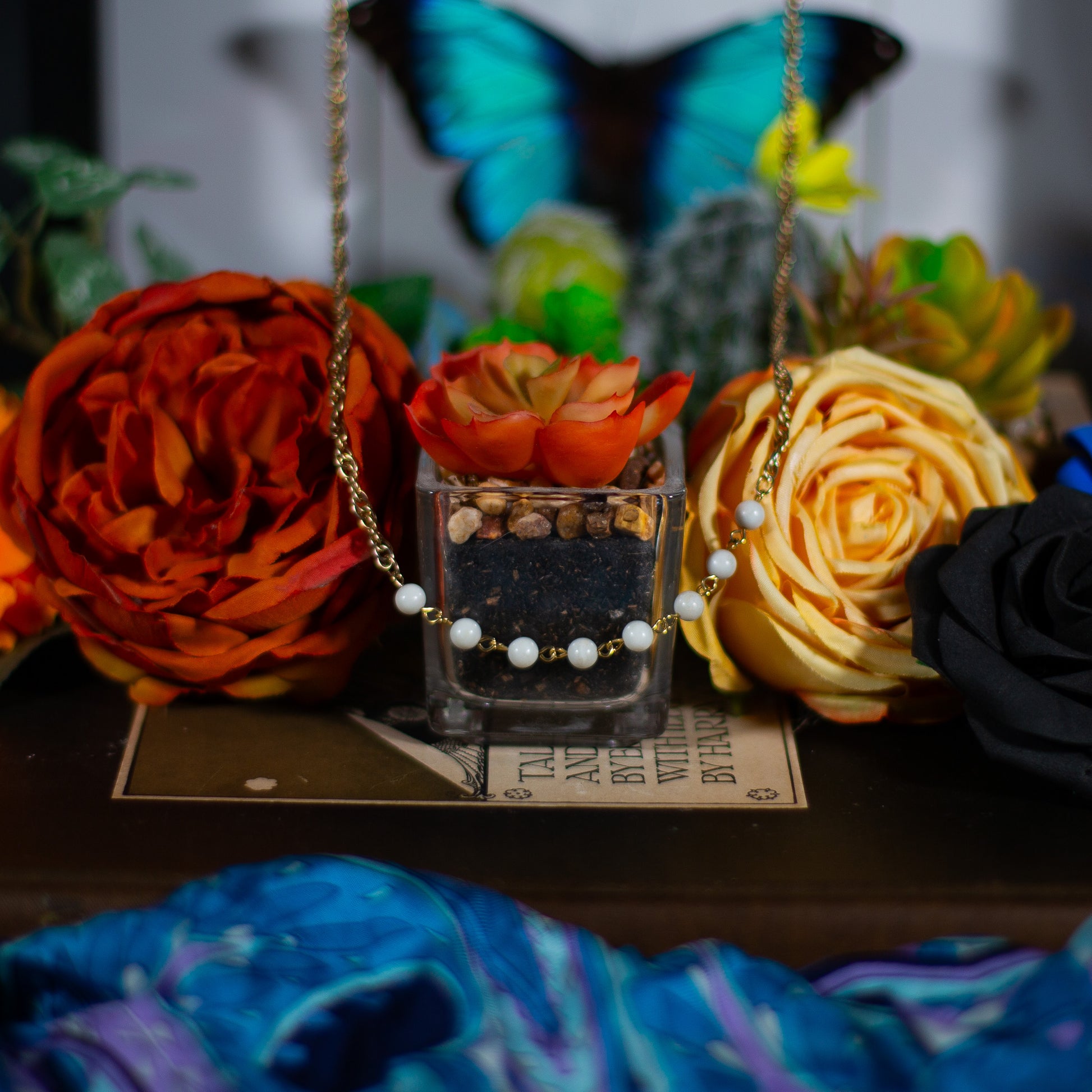 A long, clasp-less vintage chain with statement beading. Good condition.