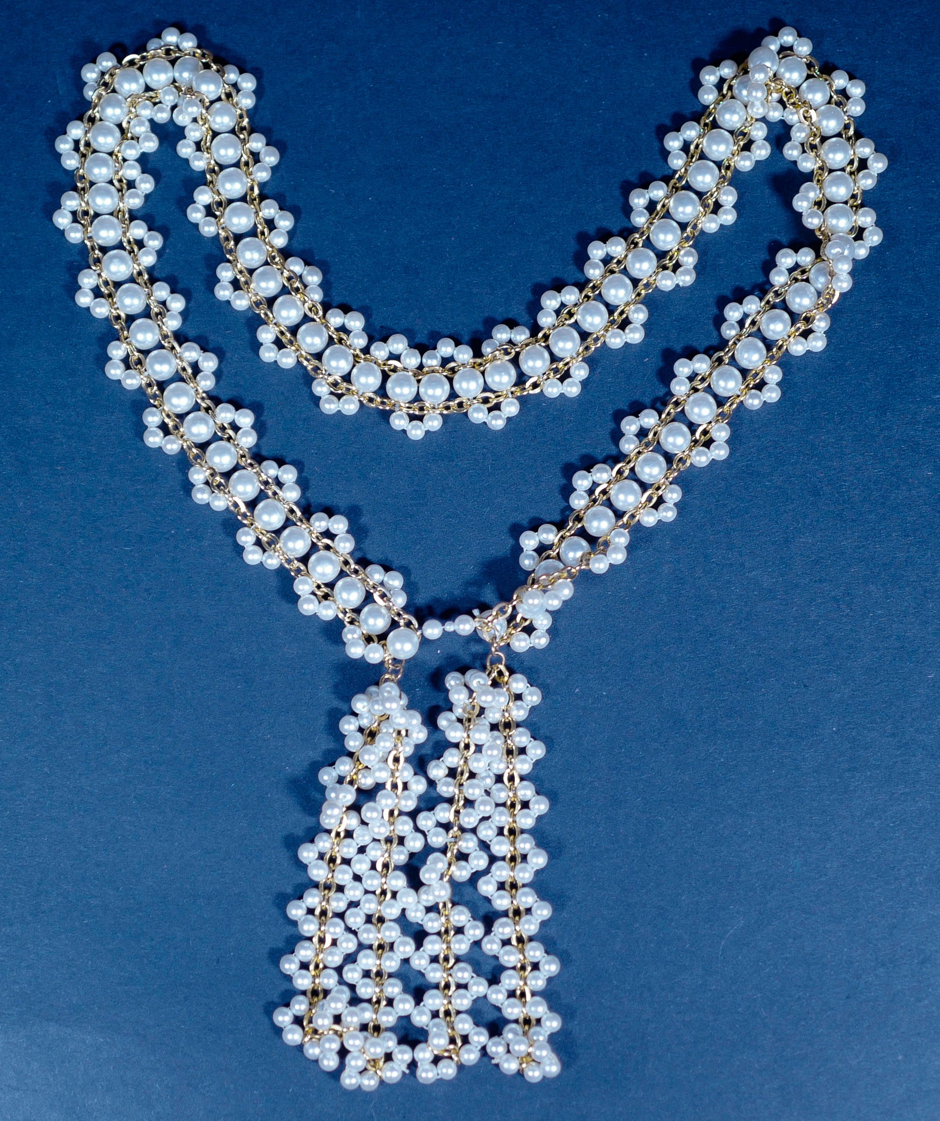 A chunky vintage necklace of interlaced faux pearls and a gold chain. Good condition.