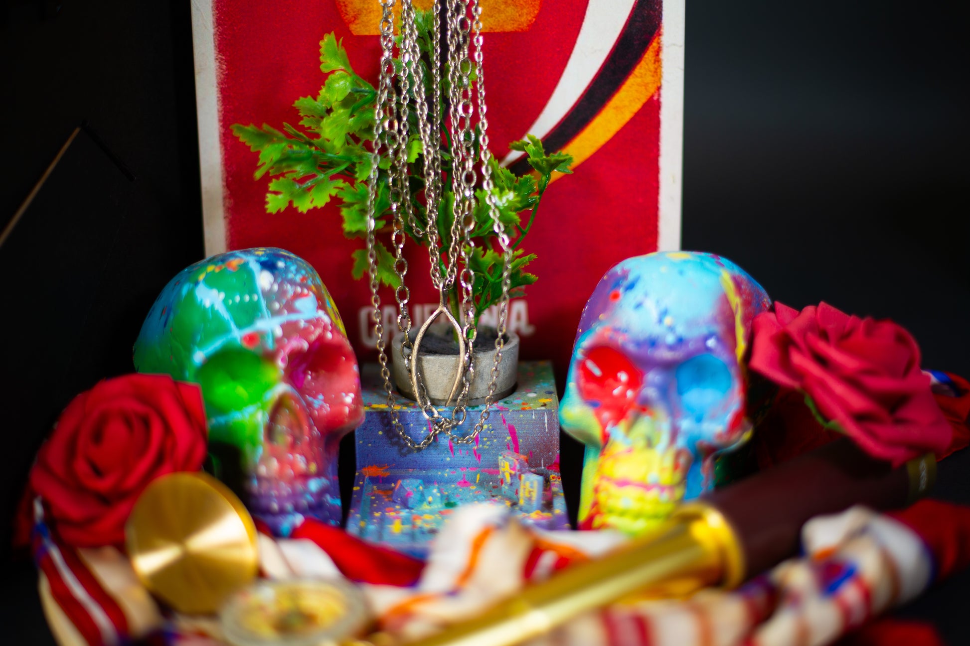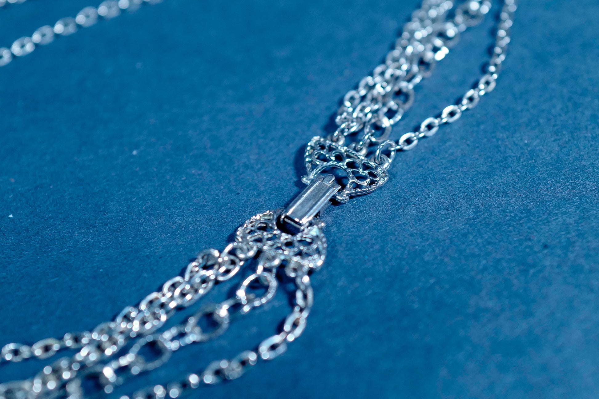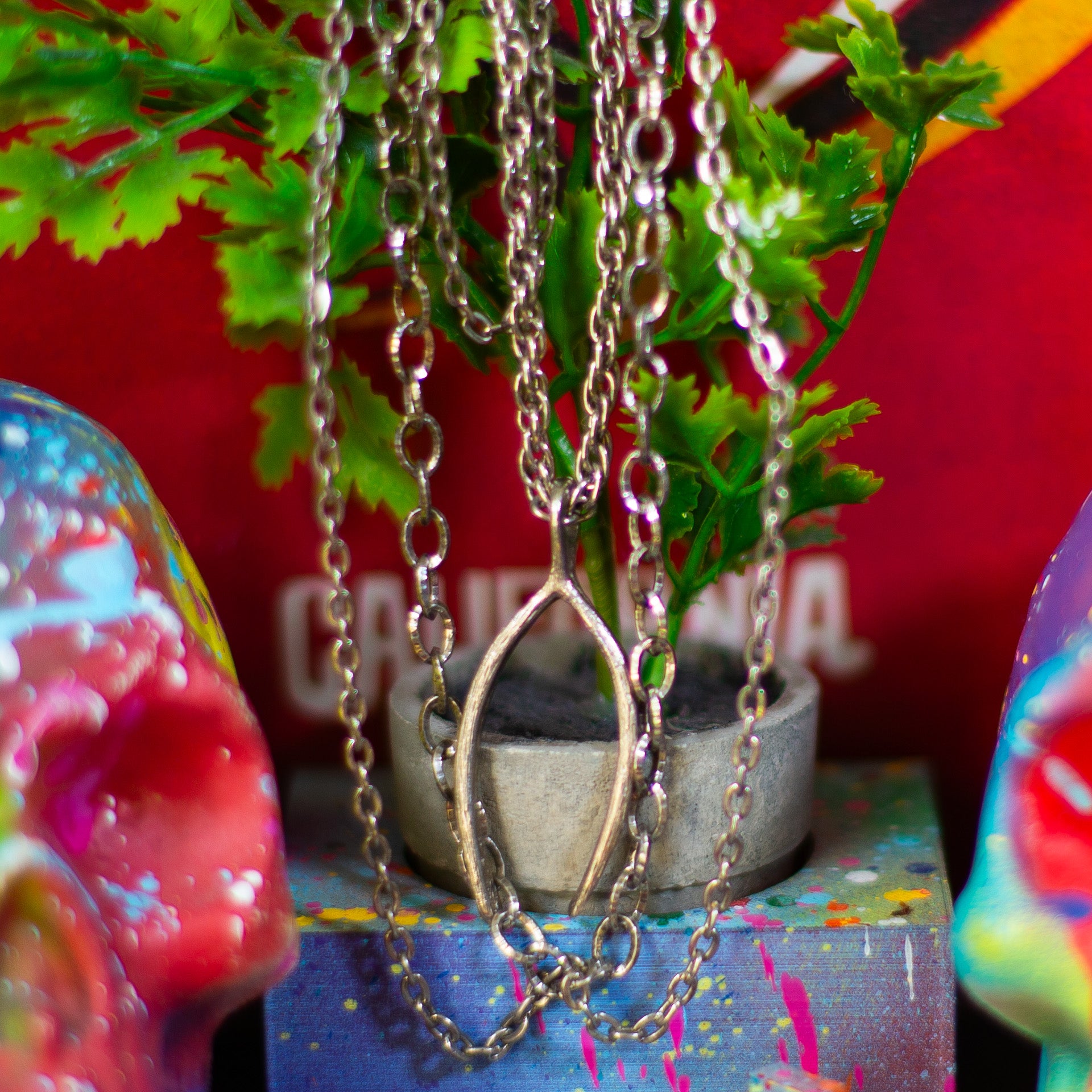 A vintage necklace layered with various chains and a whimsical wishbone charm. Good condition.