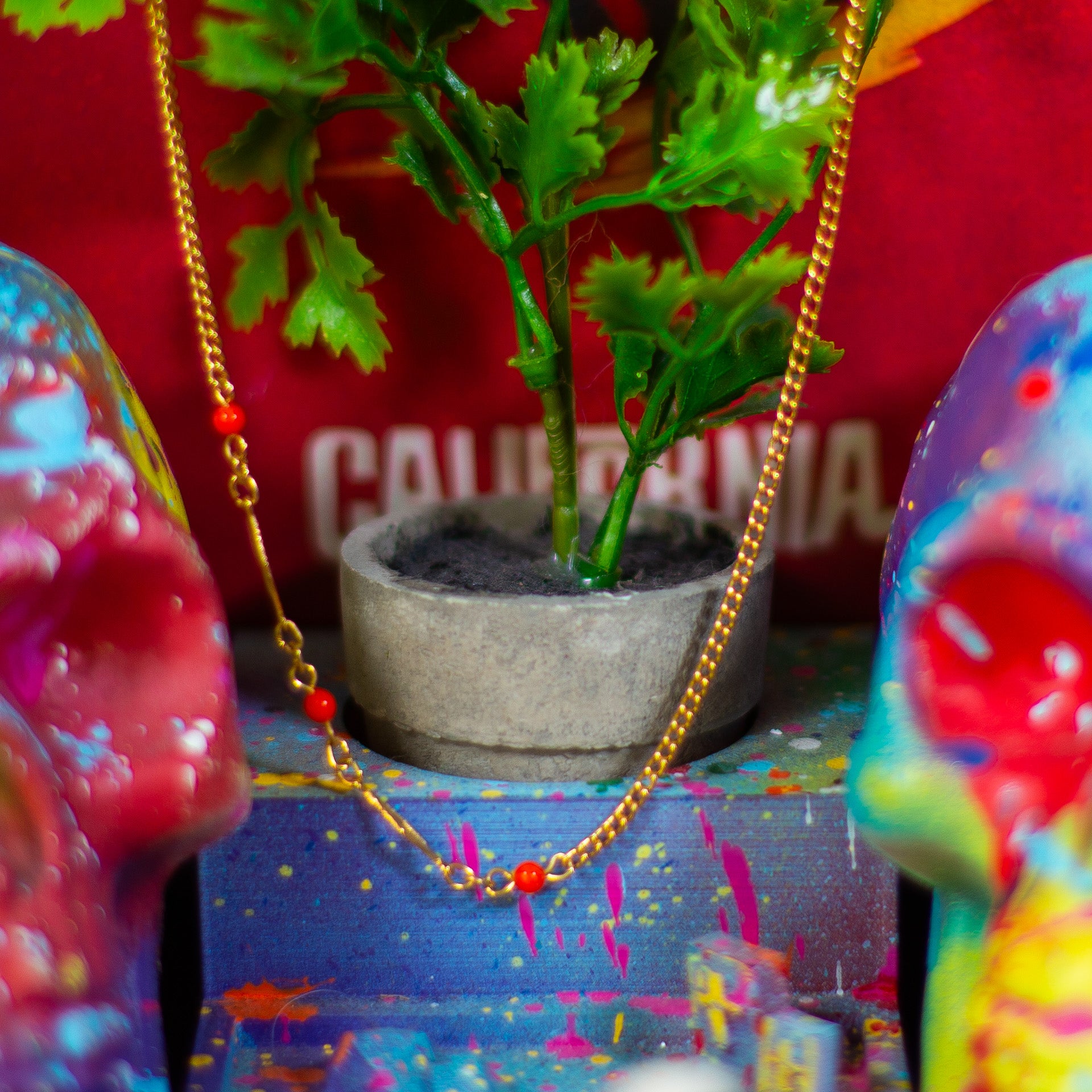 Invoke the 20'a with this art deco vintage long chain interspersed with geometric shapes and orange beads. Good condition.